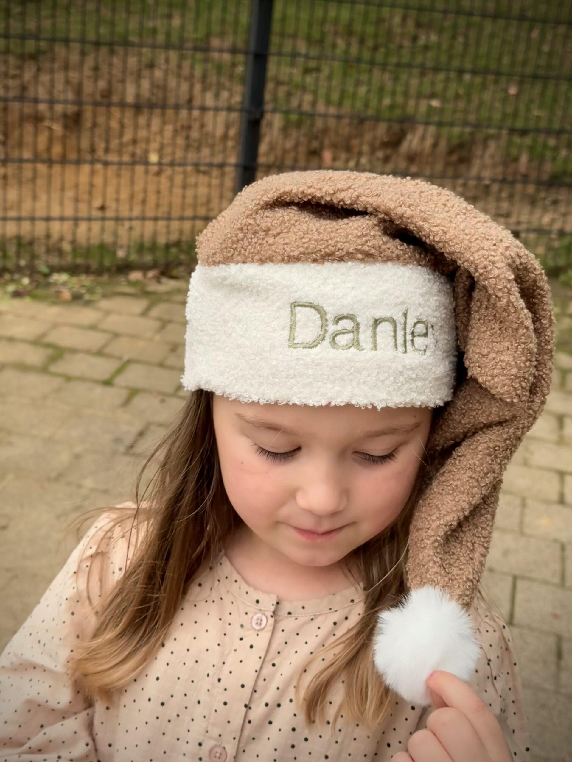 Een kerstmuts met naam in camel teddy met witte rand is zo’n bijzonder detail: stijlvol, zacht, comfortabel en bovenal uniek, omdat je hem volledig kunt personaliseren met een naam naar keuze.